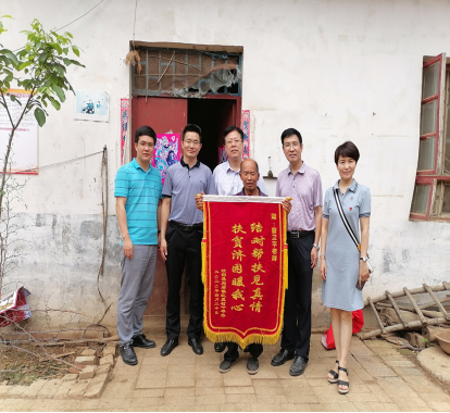 座谈会后,我们分别探望了各自联系的精准扶贫户,并送去了食品和衣物,在贫困户叶平安老人家里,老人热情地拿出了他早已经做好的锦旗双手捧送给曹卫平书记,锦旗题词“结对帮扶见真情,扶贫济困暖我心”,面对家境的日益改善,老人心怀感恩,在长达四年的扶贫工作中,早已与大家亲如一家人。
