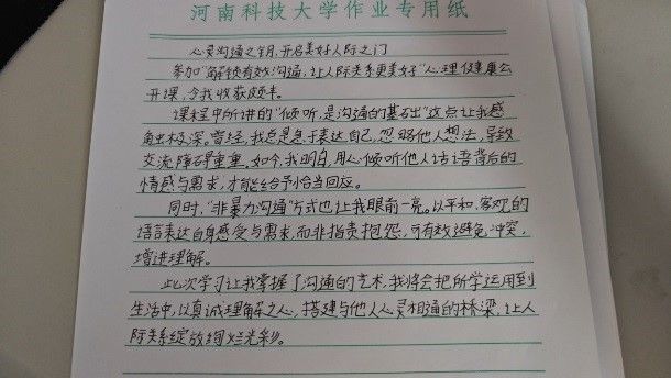 课程结束后,许多同学意犹未尽,纷纷拿起稿纸,迫不及待地将自己的所感所悟记录下来。笔尖在纸上跳跃,一行行工整的字迹,承载着同学们对有效沟通深刻理解与体会。