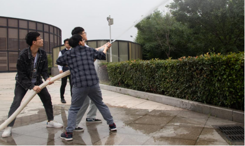 灭火演练在图书馆西北角广场进行,分灭火器操作和消防水带使用两个科目。首先进行是灭火器操作。教员梅霖讲述并示范灭火器使用方法。上下颠倒摇晃几次,拔掉铅封,一手扶喷管,喷嘴对准火焰根部,用力压下压把即可。之后,每位同学均进行实际操作。灭火器操作科目结束后,进行消防水带使用实际操作。教员梅霖边讲述边示范,将消防水带展开后,一头接消火栓分水口,另一头接水枪,当拿水枪三人准备好后,打开消火栓阀门即可喷水灭火。随后,同学们轮流进行操作。