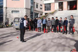 全体师生疏散到楼下广场,在教员们组织下,学习如何使用灭火器,火源点燃后,大家拔掉安全销,按压把手,手持软管对准火源一齐喷射,现场粉尘飞扬,火源被迅速扑灭,大家又掌握了一项实战技能。