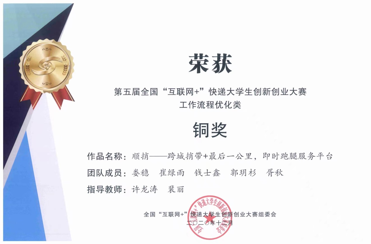 近日,第五届全国“互联网+”快递大学生创新创业大赛落下帷幕。经过激烈角逐,由土木工程学院工程力学系党支部的党员许龙涛老师和丽正社区第二党支部的党员裴丽老师为指导老师的顺捎团队在全国赛中获得了第五届全国“互联网+”快递大学生创新创业大赛铜奖。